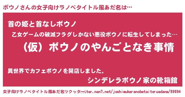 | 男性向けラノベタイトル風あだ名 | 『ボウノの憂鬱』『はたらくボウノさま!』 |
