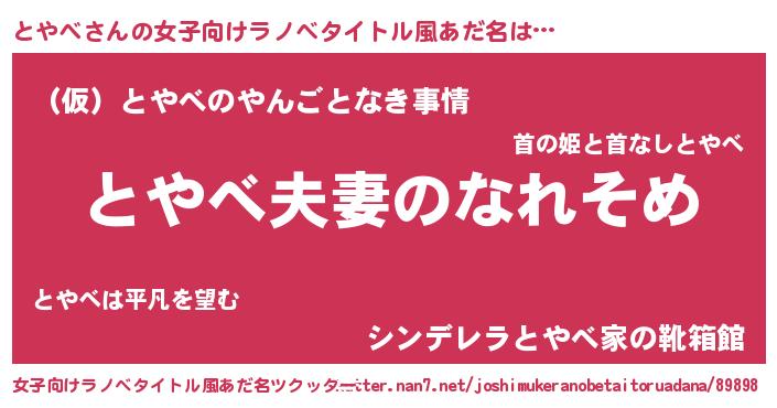 | 男性向けラノベタイトル風あだ名 | 『おまえをオタクにしてやるから、俺をとやべにしてくれ! 』 |