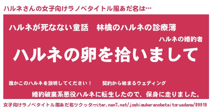 | 男性向けラノベタイトル風あだ名 | 『ハルネの嫁は女の子じゃないと思った?』 |