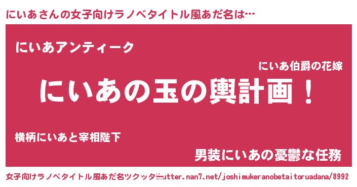 にいあさんの女子向けラノベタイトル風あだ名は… 『にいあの玉の輿計画!』『にいあアンティーク』『男装にいあの憂鬱な任務』 ツクッター #女子向けラノベタイトル風あだ名ツクッター http://tkutter.nan7.net/joshimukeranobetaitoruadana/8992/