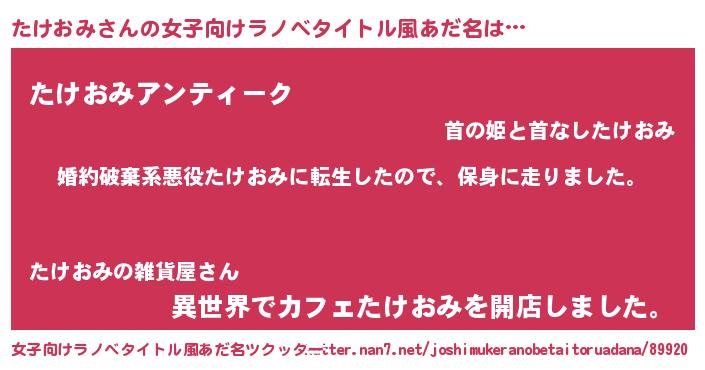 | 男性向けラノベタイトル風あだ名 | 『転生したらたけおみだった件』 |