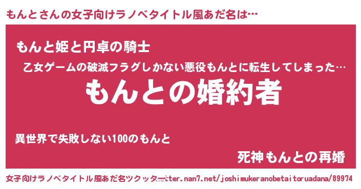 もんとさんの女子向けラノベタイトル風あだ名は… 『もんとの婚約者』『もんと姫と円卓の騎士』『死神もんとの再婚』 ツクッター #女子向けラノベタイトル風あだ名ツクッター http://tkutter.nan7.net/joshimukeranobetaitoruadana/89974/