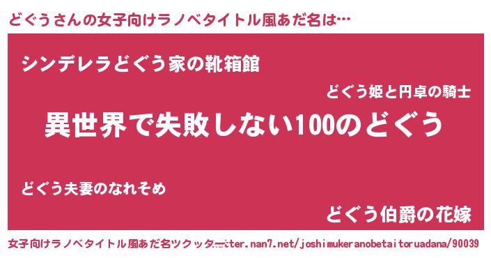 | 男性向けラノベタイトル風あだ名 | 『どぐうという概念が存在しない退屈な世界 』 |