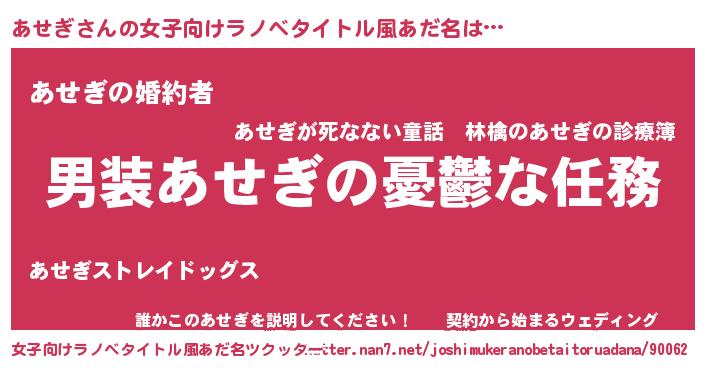 | 男性向けラノベタイトル風あだ名 | 『うちのあせぎが世界を掌握している!』 |
