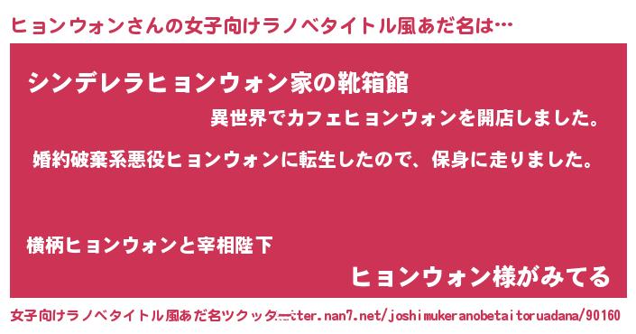 | 男性向けラノベタイトル風あだ名 | 『転生したらヒョンウォンだった件』 |