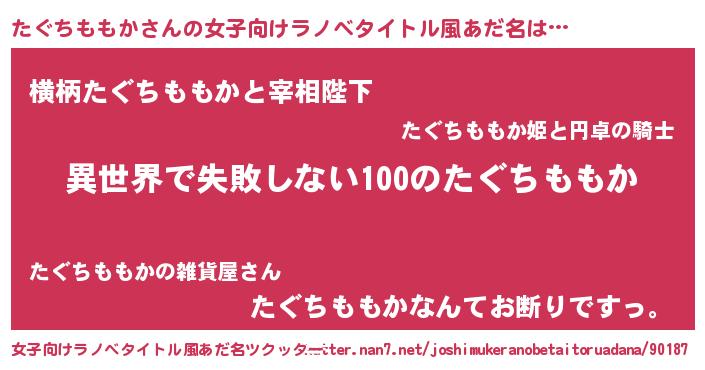 たぐちももかさんの女子向けラノベタイトル風あだ名は… 『異世界で失敗しない100のたぐちももか』『横柄たぐちももかと宰相陛下』『たぐちももかなんてお断りですっ。』 ツクッター #女子向けラノベタイトル風あだ名ツクッター http://tkutter.nan7.net/joshimukeranobetaitoruadana/90187/