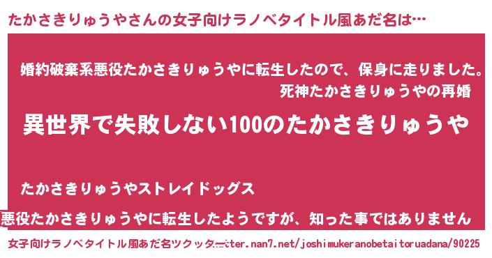 | 男性向けラノベタイトル風あだ名 | 『たかさきりゅうやという概念が存在しない退屈な世界 』 |