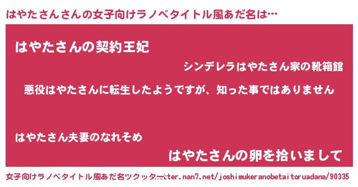 | 男性向けラノベタイトル風あだ名 | 『この素晴らしい世界にはやたさんを!』 |