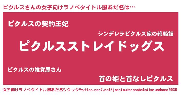 | 男性向けラノベタイトル風あだ名 | 『Re:ピクルスから始める異世界生活』 |