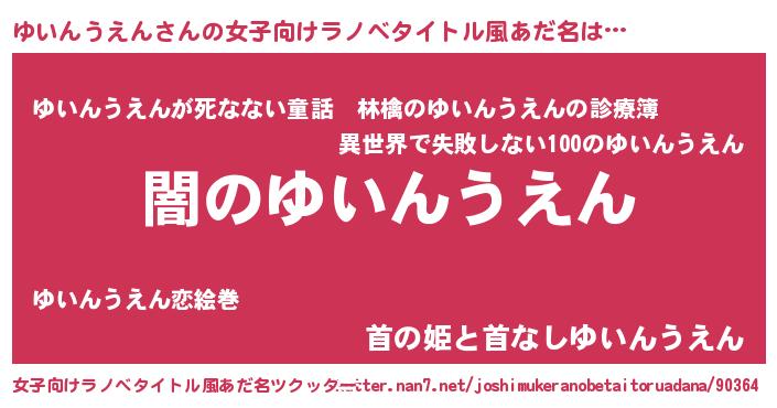 | 男性向けラノベタイトル風あだ名 | 『Re:ゆいんうえんから始める異世界生活』 |
