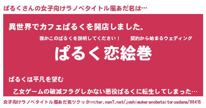 | 男性向けラノベタイトル風あだ名 | 『おまえをオタクにしてやるから、俺をぱるくにしてくれ! 』 |