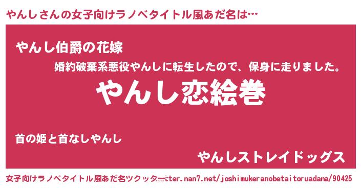| 男性向けラノベタイトル風あだ名 | 『おまえをオタクにしてやるから、俺をやんしにしてくれ! 』 |