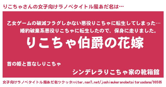 | 男性向けラノベタイトル風あだ名 | 『うちの娘の為ならば、俺はもしかしたらりこちゃも倒せるかもしれない。』 |