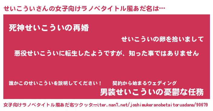 | 男性向けラノベタイトル風あだ名 | 『この素晴らしい世界にせいこういを!』 |