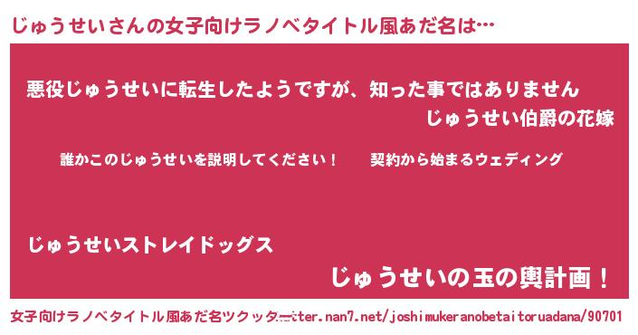 | 男性向けラノベタイトル風あだ名 | 『ジュウセイアートオンライン』 |