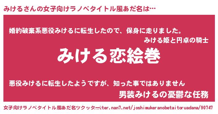 | 男性向けラノベタイトル風あだ名 | 『おまえをオタクにしてやるから、俺をみけるにしてくれ! 』 |