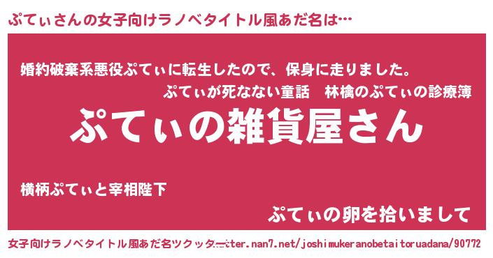 ぷてぃさんの女子向けラノベタイトル風あだ名は… 『ぷてぃの雑貨屋さん』『婚約破棄系悪役ぷてぃに転生したので、保身に走りました。』『ぷてぃの卵を拾いまして』 ツクッター #女子向けラノベタイトル風あだ名ツクッター http://tkutter.nan7.net/joshimukeranobetaitoruadana/90772/