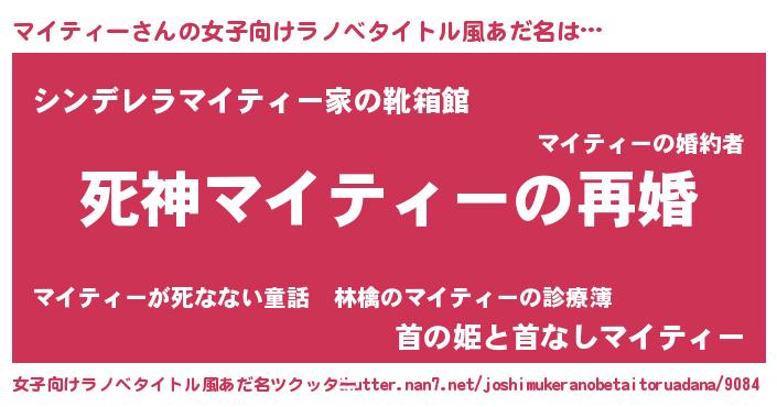 マイティーさんの女子向けラノベタイトル風あだ名は… 『死神マイティーの再婚』『シンデレラマイティー家の靴箱館』『首の姫と首なしマイティー』 ツクッター #女子向けラノベタイトル風あだ名ツクッター http://tkutter.nan7.net/joshimukeranobetaitoruadana/9084/