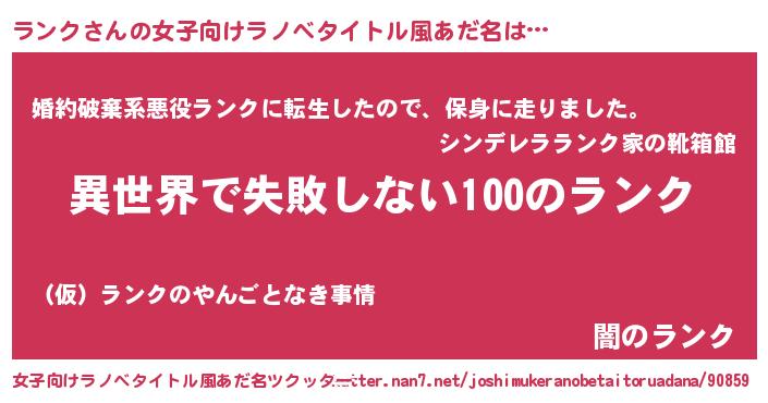 ランクさんの女子向けラノベタイトル風あだ名は… 『異世界で失敗しない100のランク』『婚約破棄系悪役ランクに転生したので、保身に走りました。』『闇のランク』 ツクッター #女子向けラノベタイトル風あだ名ツクッター http://tkutter.nan7.net/joshimukeranobetaitoruadana/90859/