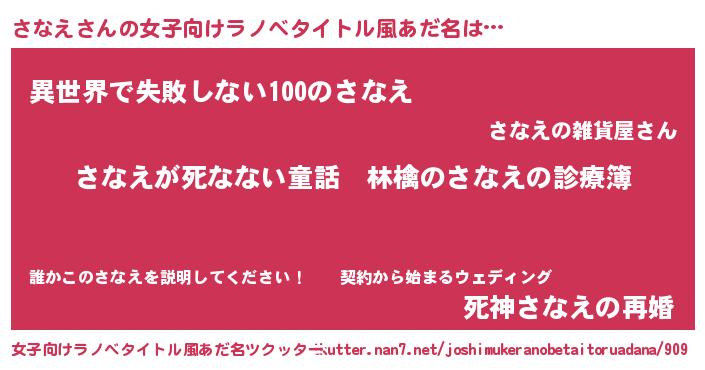 さなえさんの女子向けラノベタイトル風あだ名は… 『さなえが死なない童話 林檎のさなえの診療簿』『異世界で失敗しない100のさなえ』『死神さなえの再婚』 ツクッター #女子向けラノベタイトル風あだ名ツクッター http://tkutter.nan7.net/joshimukeranobetaitoruadana/909/