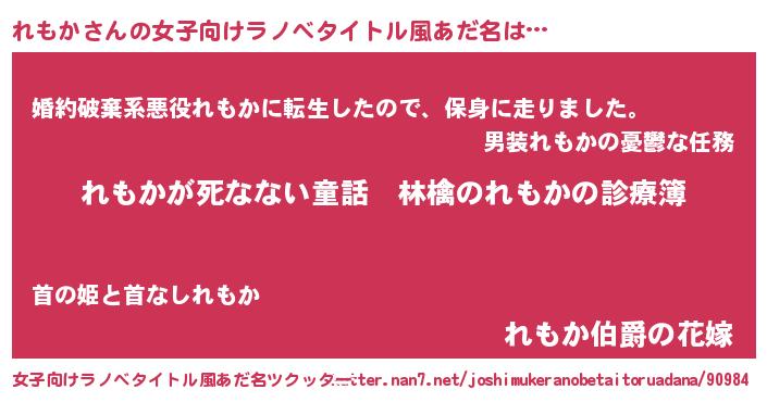 | 男性向けラノベタイトル風あだ名 | 『魔弾の王とれもか』『レモカスレイヤー』 |