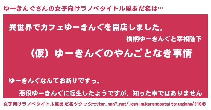 ゆーきんぐさんの女子向けラノベタイトル風あだ名は… 『(仮)ゆーきんぐのやんごとなき事情』『異世界でカフェゆーきんぐを開店しました。』『悪役ゆーきんぐに転生したようですが、知った事ではありません』 ツクッター #女子向けラノベタイトル風あだ名ツクッター http://tkutter.nan7.net/joshimukeranobetaitoruadana/91045/
