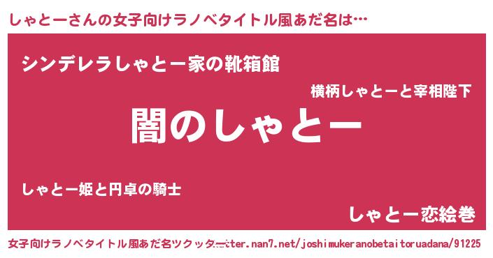 | 男性向けラノベタイトル風あだ名 | 『Re:しゃとーから始める異世界生活』 |