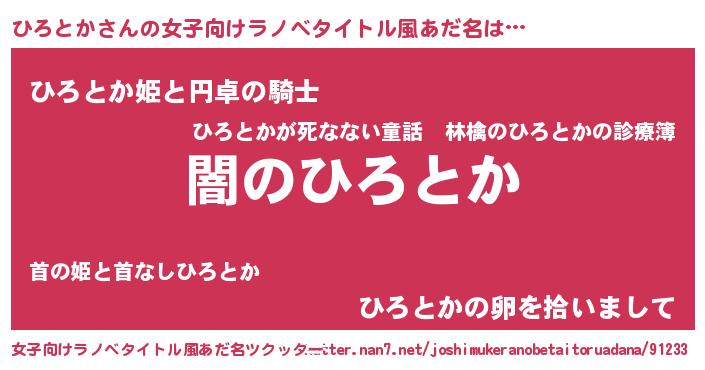 | 男性向けラノベタイトル風あだ名 | 『Re:ひろとかから始める異世界生活』 |