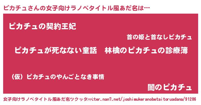 | 男性向けラノベタイトル風あだ名 | 『魔弾の王とピカチュ』『ピカチュの憂鬱』 |