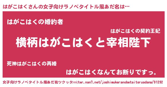 | 男性向けラノベタイトル風あだ名 | 『はがこはくに滅ぼされるだけの簡単なお仕事です』 |