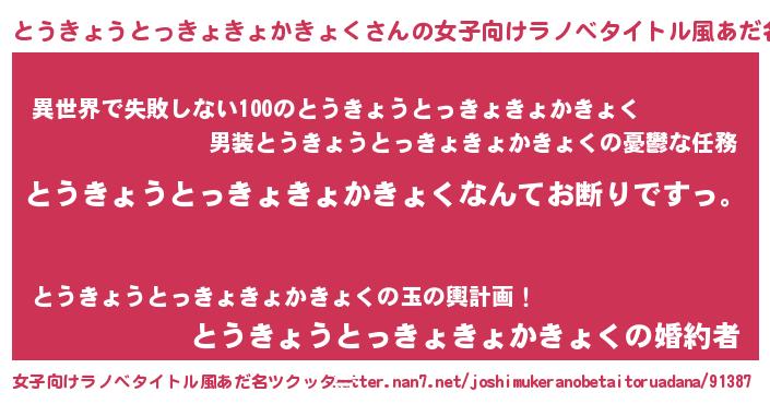 とうきょうとっきょきょかきょくさんの女子向けラノベタイトル風あだ名は… 『とうきょうとっきょきょかきょくなんてお断りですっ。』『異世界で失敗しない100のとうきょうとっきょきょかきょく』『とうきょうとっきょきょかきょくの婚約者』 ツクッター #女子向けラノベタイトル風あだ名ツクッター http://tkutter.nan7.net/joshimukeranobetaitoruadana/91387/