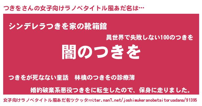 | 男性向けラノベタイトル風あだ名 | 『Re:つきをから始める異世界生活』 |
