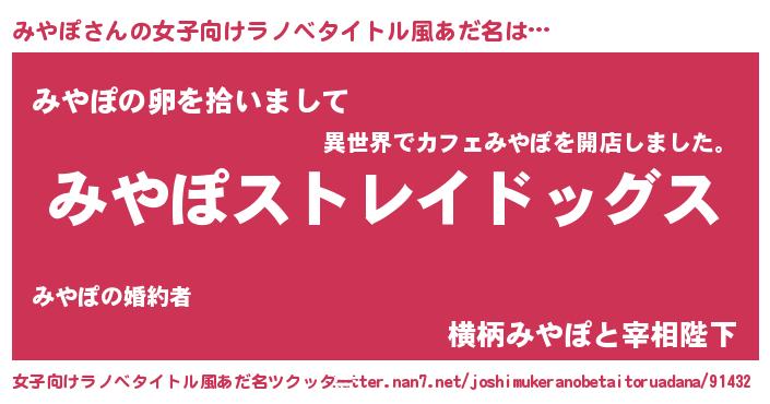 | 男性向けラノベタイトル風あだ名 | 『Re:みやぽから始める異世界生活』 |