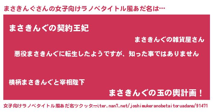 | 男性向けラノベタイトル風あだ名 | 『この素晴らしい世界にまさきんぐを!』 |