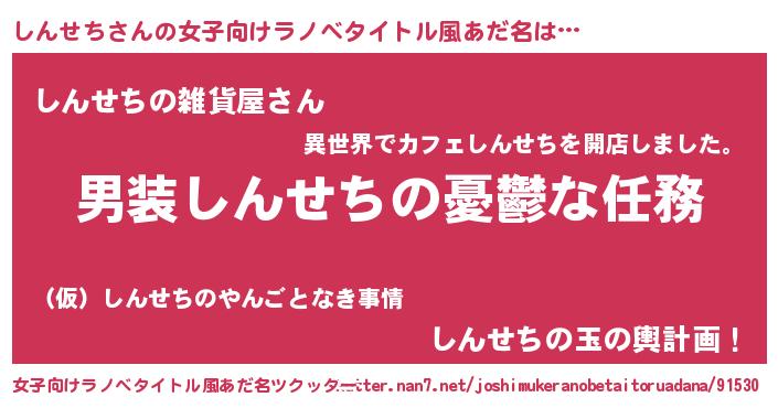 | 男性向けラノベタイトル風あだ名 | 『うちのしんせちが世界を掌握している!』 |