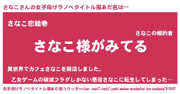 | 男性向けラノベタイトル風あだ名 | 『さなこの嫁は女の子じゃないと思った?』 |