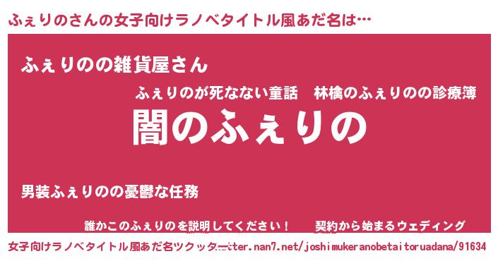 | 男性向けラノベタイトル風あだ名 | 『Re:ふぇりのから始める異世界生活』 |