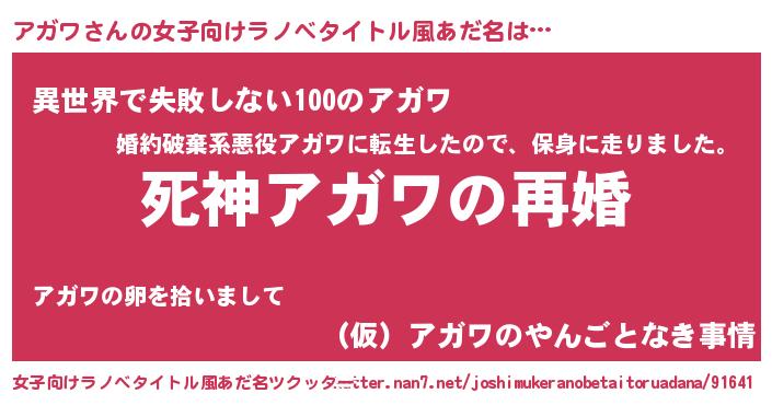| 男性向けラノベタイトル風あだ名 | 『ノーゲーム・ノーアガワ』 |