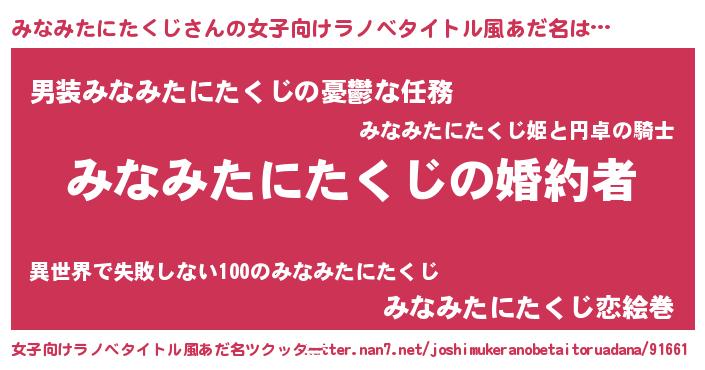 | 男性向けラノベタイトル風あだ名 | 『うちの娘の為ならば、俺はもしかしたらみなみたにたくじも倒せるかもしれない。』 |