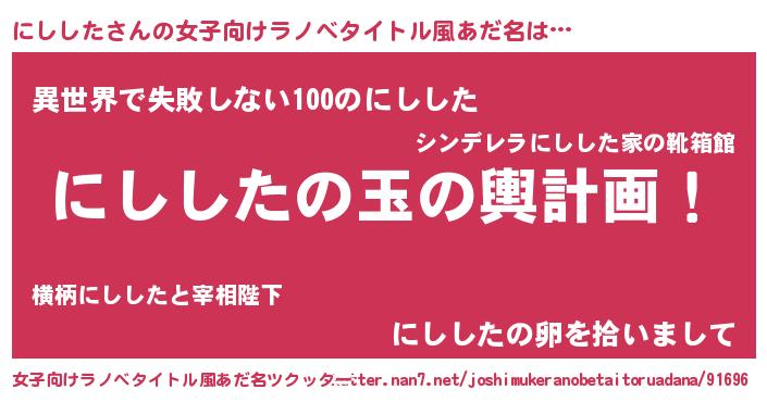 | 男性向けラノベタイトル風あだ名 | 『にしした~年齢イコール彼女いない歴の魔法使い~』 |