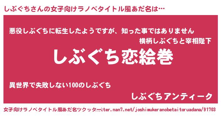 | 男性向けラノベタイトル風あだ名 | 『おまえをオタクにしてやるから、俺をしぶぐちにしてくれ! 』 |
