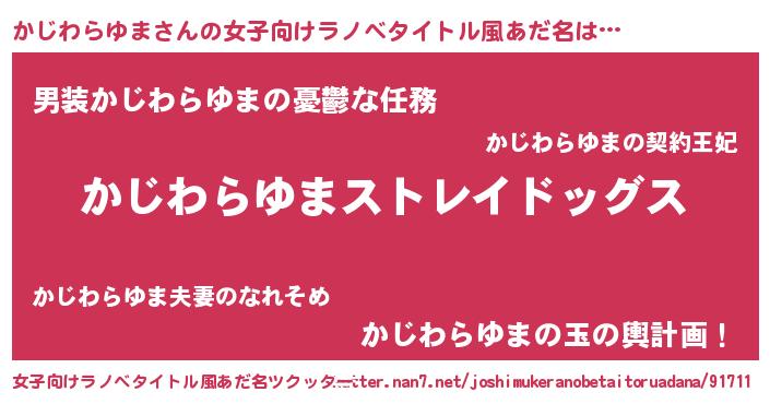 かじわらゆまさんの女子向けラノベタイトル風あだ名は… 『かじわらゆまストレイドッグス』『男装かじわらゆまの憂鬱な任務』『かじわらゆまの玉の輿計画!』 ツクッター #女子向けラノベタイトル風あだ名ツクッター http://tkutter.nan7.net/joshimukeranobetaitoruadana/91711/