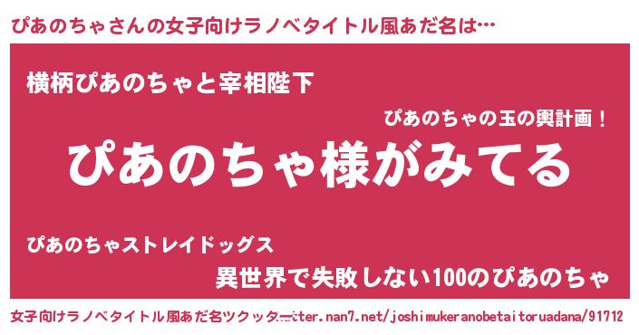 | 男性向けラノベタイトル風あだ名 | 『ぴあのちゃの嫁は女の子じゃないと思った?』 |