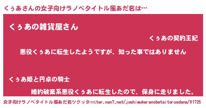 | 男性向けラノベタイトル風あだ名 | 『この素晴らしい世界にくぅあを!』 |