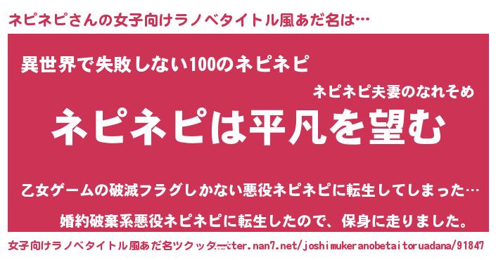 | 男性向けラノベタイトル風あだ名 | 『ダンジョンにネピネピを求めるのは間違っているだろうか』 |