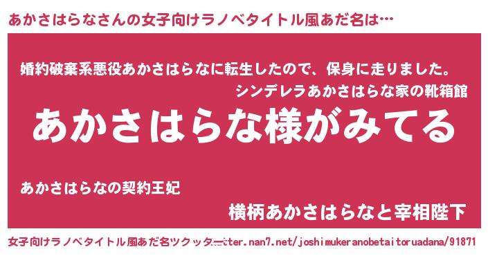 | 男性向けラノベタイトル風あだ名 | 『あかさはらなの嫁は女の子じゃないと思った?』 |