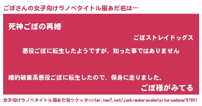 | 男性向けラノベタイトル風あだ名 | 『この素晴らしい世界にごぼを!』 |
