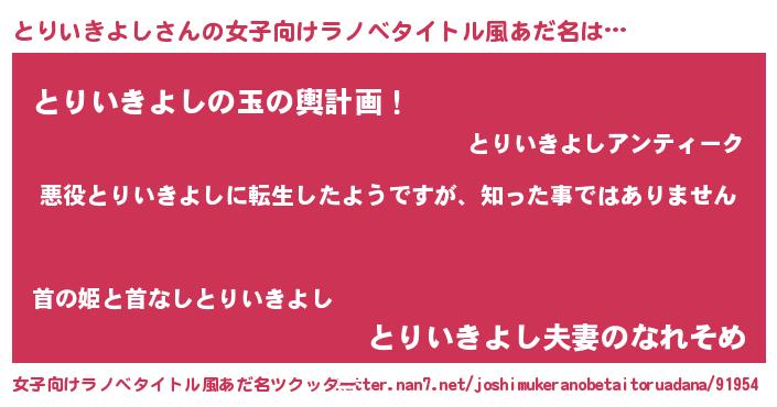 | 男性向けラノベタイトル風あだ名 | 『この素晴らしい世界にとりいきよしを!』 |