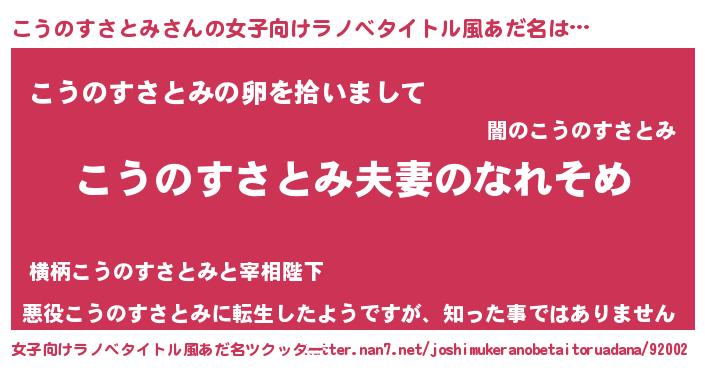 | 男性向けラノベタイトル風あだ名 | 『おまえをオタクにしてやるから、俺をこうのすさとみにしてくれ! 』 |
