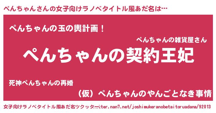 | 男性向けラノベタイトル風あだ名 | 『誰もが恐れるあのぺんちゃんが、ぼくの専属メイドになるようです。』 |